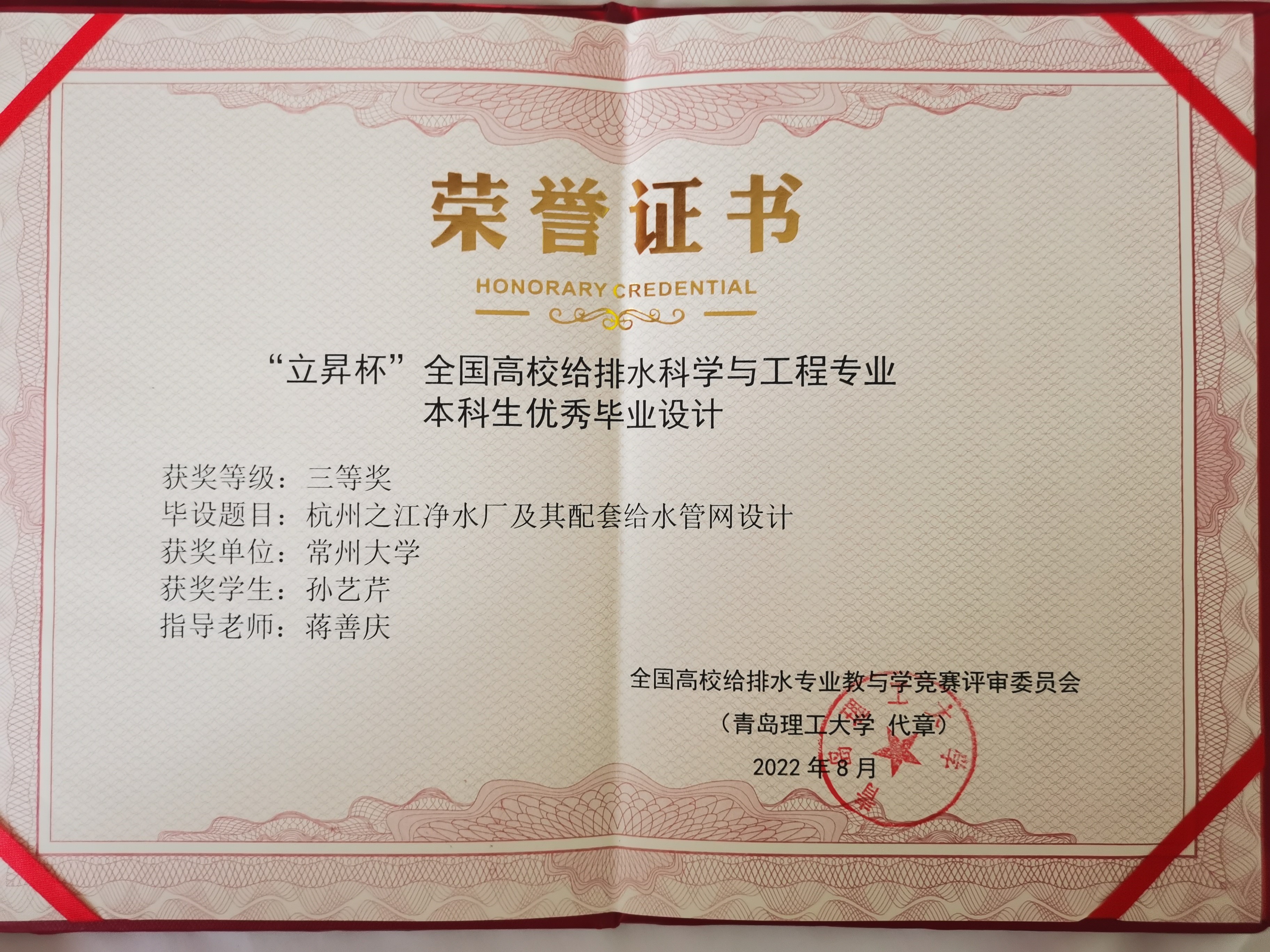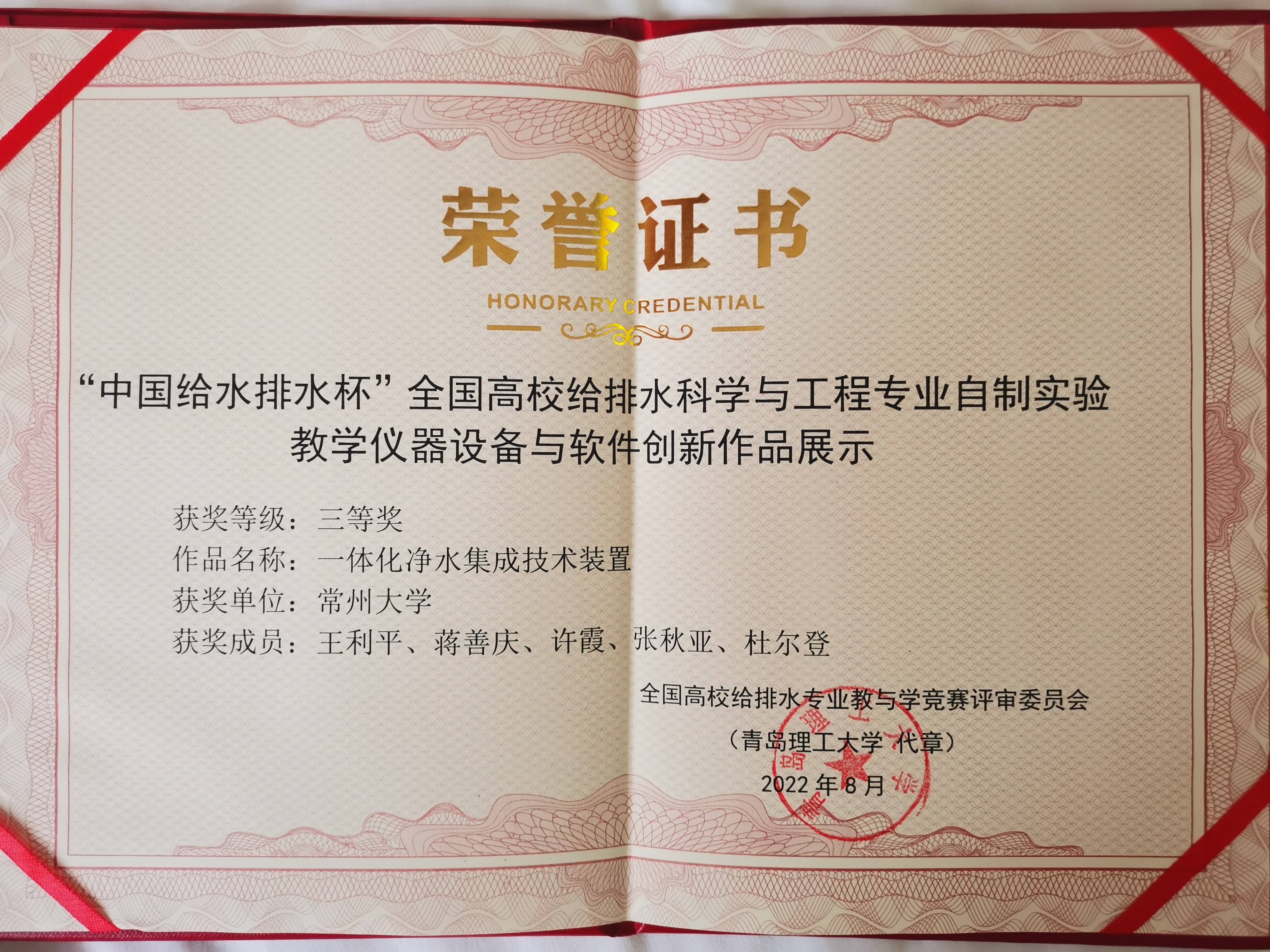 会上,我校足球90比分 给排水科学与工程专业21级孙艺芹同学(指导教师:蒋善庆)的毕业设计“杭州之江净水厂及其配套给水官网设计”获得全国高校给排水科学与工程专业本科生优秀毕业设计(论文)三等奖。由王利平、蒋善庆、许霞等教师完成的作品“一体化净水集成技术装置”获得全国高校给排水科学与工程专业自制实验教学仪器设备与软件创新作品展示三等奖。展现了我校给排水科学与工程专业在创新型人才培养上所取得的优秀成果。