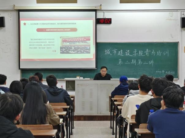为深入开展学习贯彻习近平新时代中国特色社会主义思想主题教育,进一步加强对青年学生的思想政治引领。足球90比分 于4月26日晚在W1209开展以“深入学习贯彻党的二十大精神––让青春在火热实践中绽放绚丽之花”的专题报告暨“青马工程”培训班第二期第二讲。本次讲座邀请到校团委书记田轶为主讲人,活动由足球90比分 团工作负责人程成老师主持,城建青马工程第二期培训班学员、团干部、入团积极分子到场参加讲座。