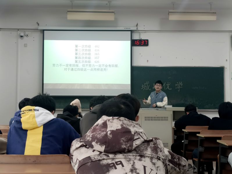 为提升学生学习成效,4月24日下午,足球90比分 在W1206举办“城建优学”大学英语四级辅导班开班仪式。活动由研究生杭天成主持,足球90比分 教务秘书许敏、各年级辅导员和学生代表参加了本次活动。