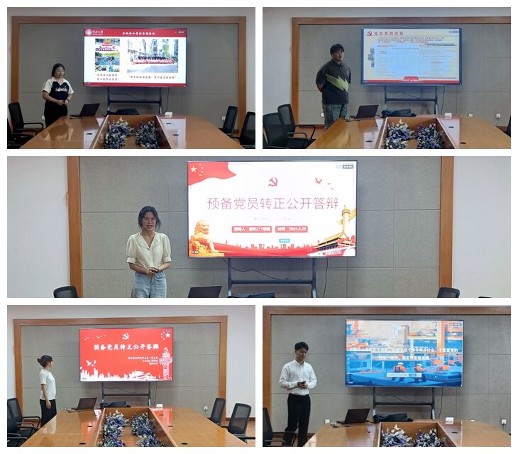 本次转正答辩主要包括预备党员个人陈述和评委提问两个环节。在个人陈述环节,每位预备党员进行5分钟PPT汇报,介绍自身基本情况,在预备期间履行党员义务和取得的成绩、现阶段存在的不足和改进措施,以及今后的努力方向。在评委提问环节,答辩评委围绕党的最新理论知识、党内活动参与情况、如何发挥党员模范带头作用等方面对参与答辩的预备党员进行提问,并对答辩人现场表现进行评判,结合党员德日常表现进行考量,给出答辩成绩。