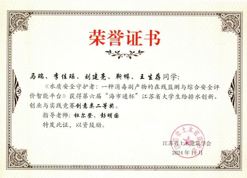 在本次竞赛中,给排水专业有4个项目获奖,其中2项作品获二等奖、2项作品获三等奖。马瑞、李佳瑶、刘建亮、靳墀、王生存同学参赛的作品《水质安全守护者:一种消毒副产物的在线监测与综合安全评价智能平台》,吴瑶、陈雨捷、常亚敏同学参赛的作品《Binding Affinity and Mechanism of Six PFAS with Human Serum Albumin:Insights from Multi-Spectroscopy,DFT and Molecular Dynamics Approaches》分获创意类、论文类二等奖。