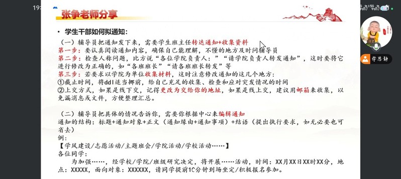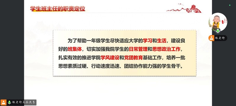 培训会上,张争系统讲解了学生班主任工作要点,涵盖职责定位、通知拟写、工作规范与考核等方面。他明确了学生班主任作为“班级工作组织者”和“新生成长引路人”的双重身份,强调了信息精准传递、班委选拔、党团指导、学风引领及迎新实务等工作重点,并对考核规范进行了说明。最后,他寄语新任班主任以身作则、加强沟通,并布置了制定“学年班级工作计划PPT”的任务。