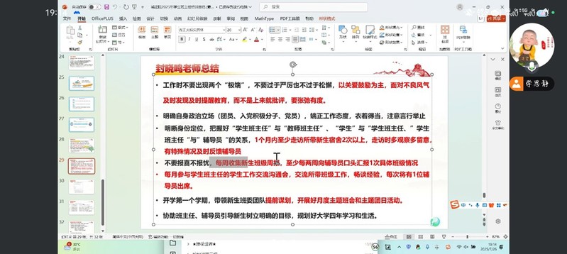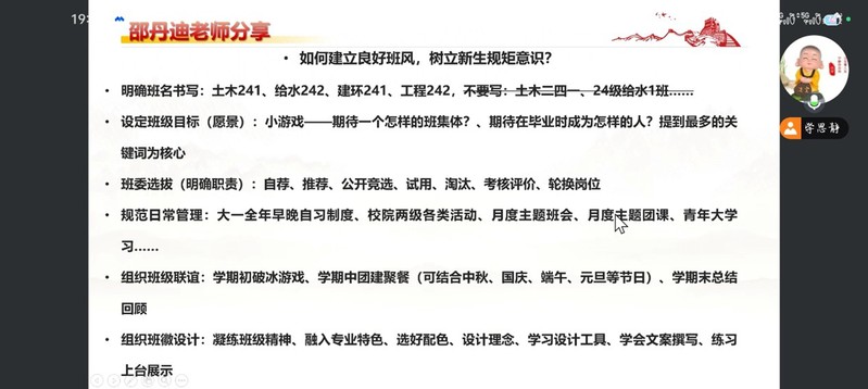 在培训过程中,邵丹迪老师聚焦班风建设,详解班名规范、班委选拔与班级活动组织要点,寄语班主任做好桥梁纽带,以朋辈之力凝聚班级合力。李欣一着眼集体融合,分享破冰游戏与团体辅导技巧,嘱托班主任以榜样之行传递正向价值,筑牢新生的专业归属感。程成则深耕学业规划,指导如何帮助新生搭建“基础-进阶-核心”的发展框架,为长远成长筑基。封晓鸣进行总结,强调管理需张弛有度、关爱与规范并行,明确身份定位与工作要求,指引开学初便锚定班会与团日方向,为班级发展立好坐标。