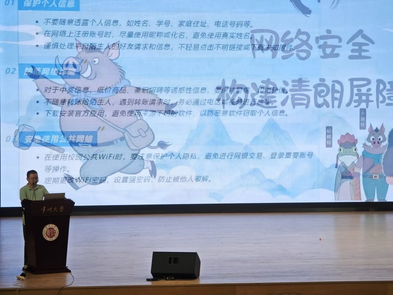 本次“开学第一课”围绕预防诈骗、法治教育、人生安全和网络安全四个方面展开。活动正式开始,辅导员张争以具体案例为引,介绍了三种类型的诈骗方式,提醒同学们要预防诈骗,提高防范意识。随后,通过一段视频,张争让同学们正确认识学生欺凌,倡导同学们对欺凌勇敢说“不”,共同创造美好安全的学习、生活环境。此外,张争还普及了许多有关防溺水安全、消防安全方面的知识与自救方法。最后,突出强调网络安全板块,总结了许多校园网络安全知识要点。